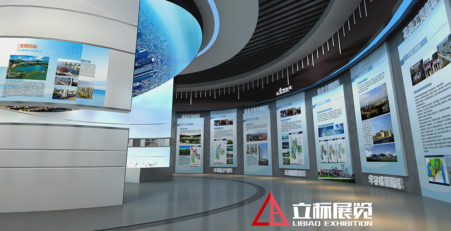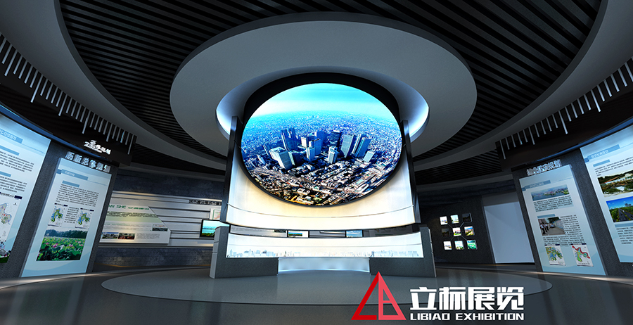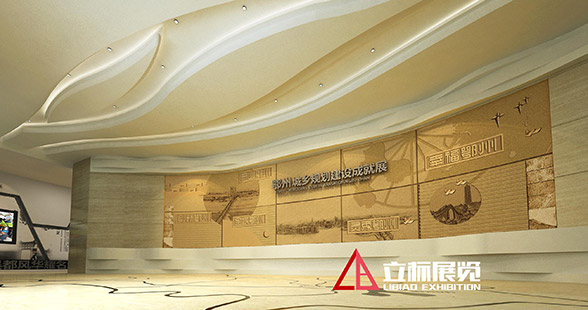 序廳設(shè)計簡潔高雅而不失恢宏大氣,天花以婉轉(zhuǎn)流美的曲線勾勒出奔騰的長江意象,與地板上的寫意地圖上下呼應(yīng),讓觀眾在俯仰之間感受鄂州通江達海的優(yōu)勢區(qū)位和襟江帶湖的水韻氣質(zhì)。迎面的主題形象墻上,連綿的曲線猶如長江之波,溫潤著這座秀美的城市。波浪之上,厚重的浮雕鋪展開以“五個鄂州”為主題的壯美畫卷,山水掩映間,一座宜居宜業(yè)的組群式大城市正呼之欲出。