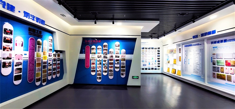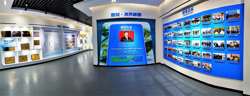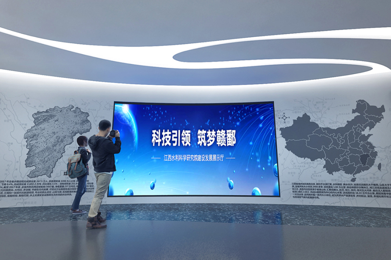 弧形墻體展示設計,展示的是水科院的人物風采、歷史變遷,創(chuàng)造出一種一覽無余的視覺效果,并給人環(huán)抱感。