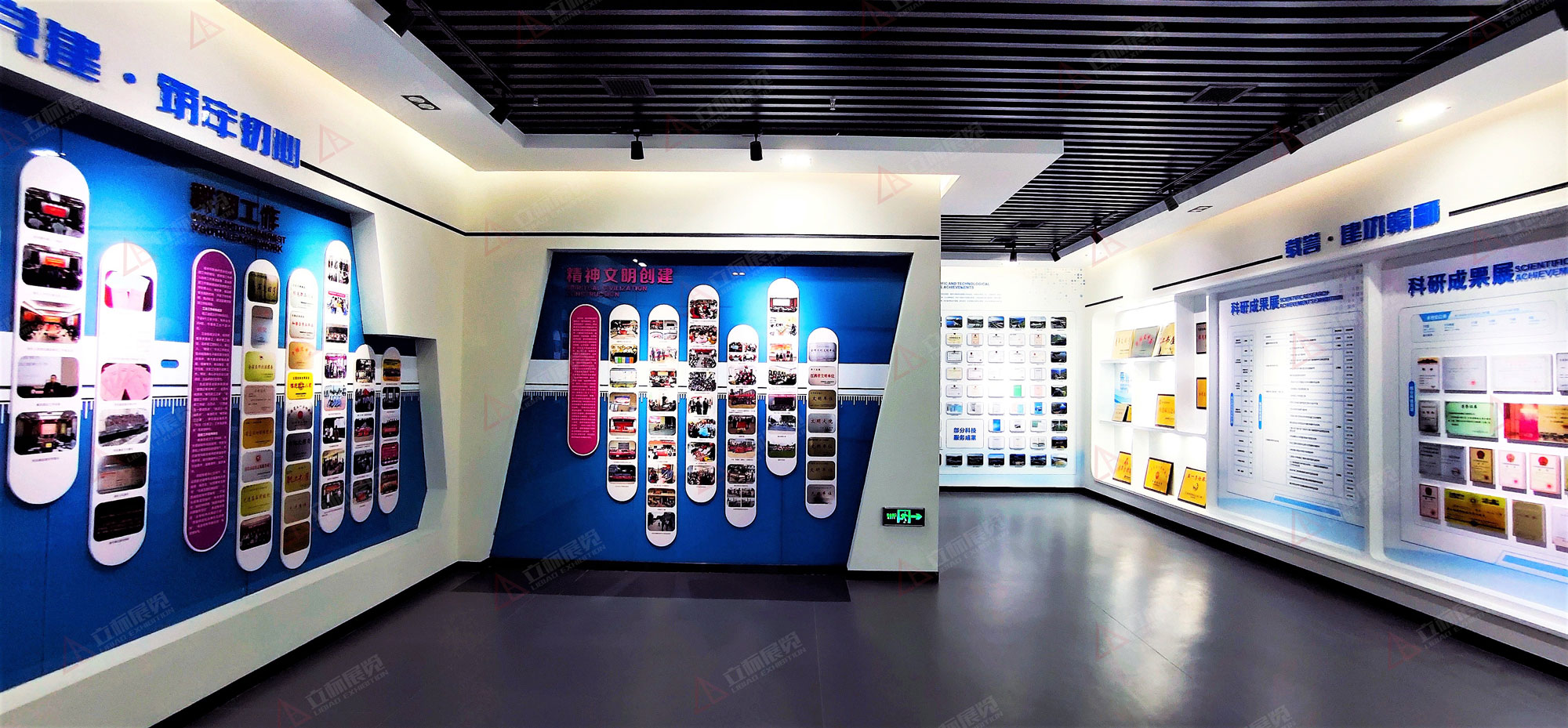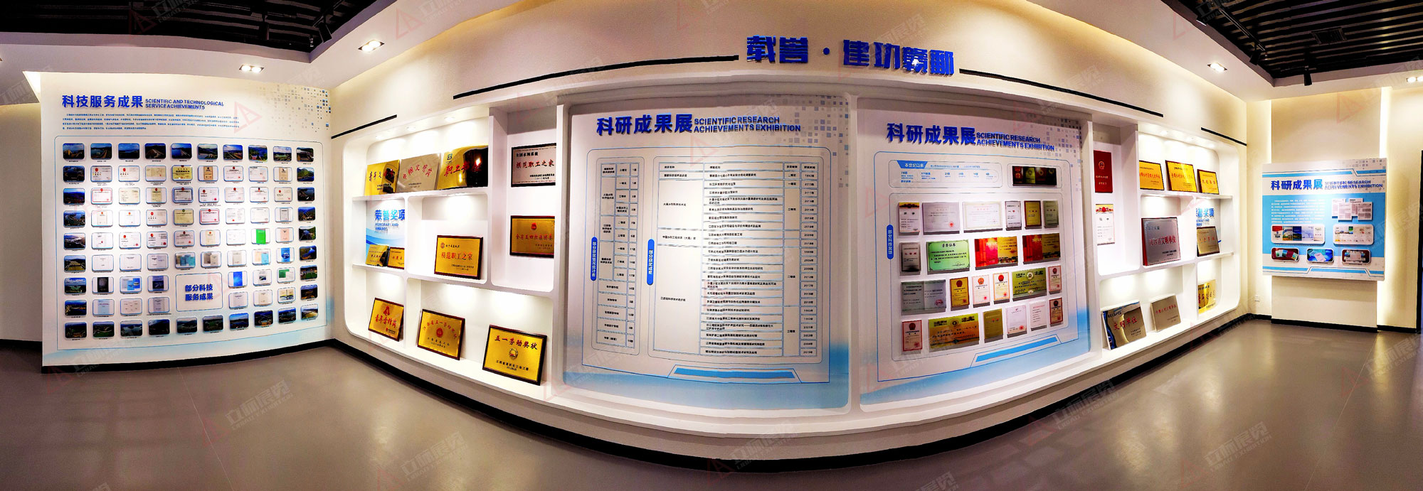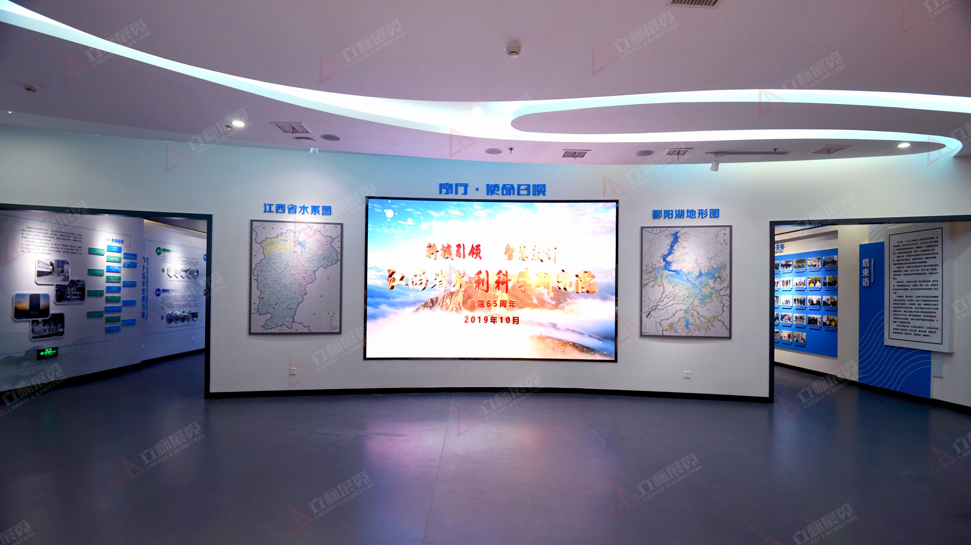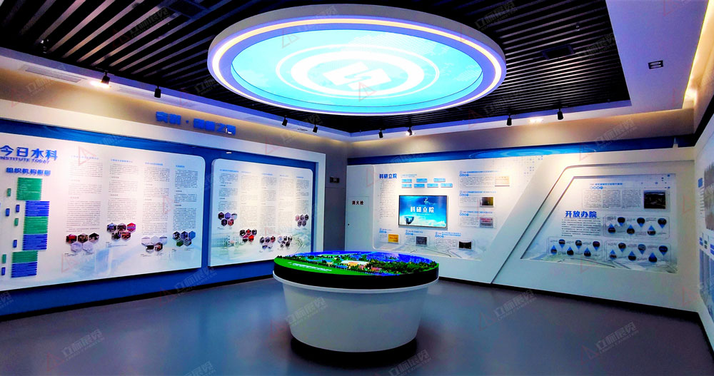 展館突出“水”元素,強(qiáng)化“水”主題,展現(xiàn)“水”文化特色,設(shè)計(jì)元素契合水科院文化特色綜合運(yùn)用聲光電,結(jié)合投影、場(chǎng)景裝置以及互動(dòng)裝置等,展示形式多樣化豐富天花、地面、界面的色調(diào)、造型表現(xiàn),各個(gè)版塊空間的調(diào)性有所區(qū)分,使小空間的主題演繹異彩紛呈,使觀展節(jié)奏更加張弛有度。